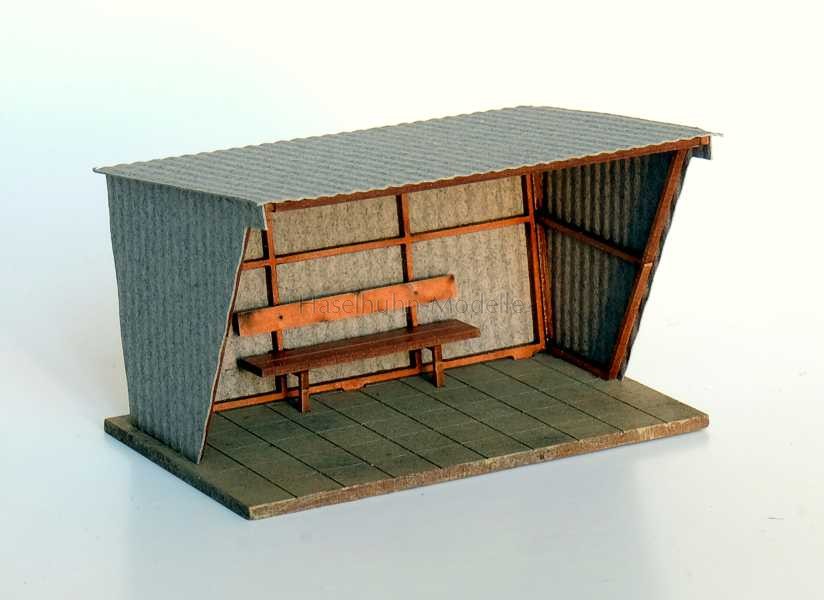 Modell einer Wartehalle für Bus- und Bahnreisende, zum Schutz vor Wind und Wetter mit Wellasbest verkleidet, alle Bauteile lasergeschnitten, Farbgebung ist nur für die Bodenplatte erforderlich - Zusatzinformation